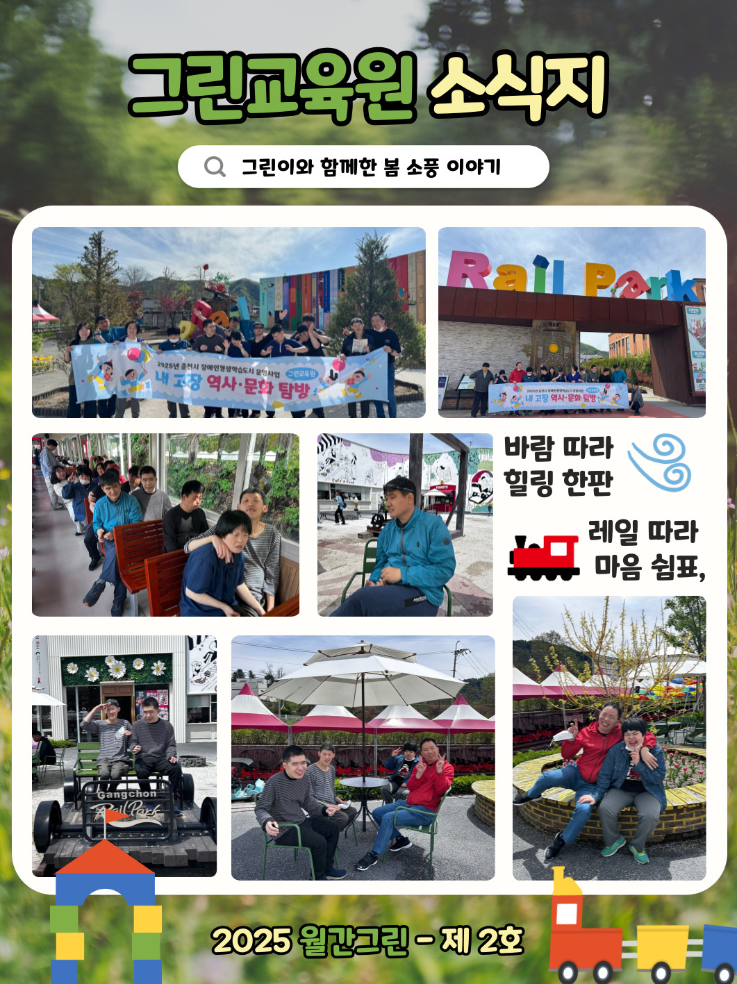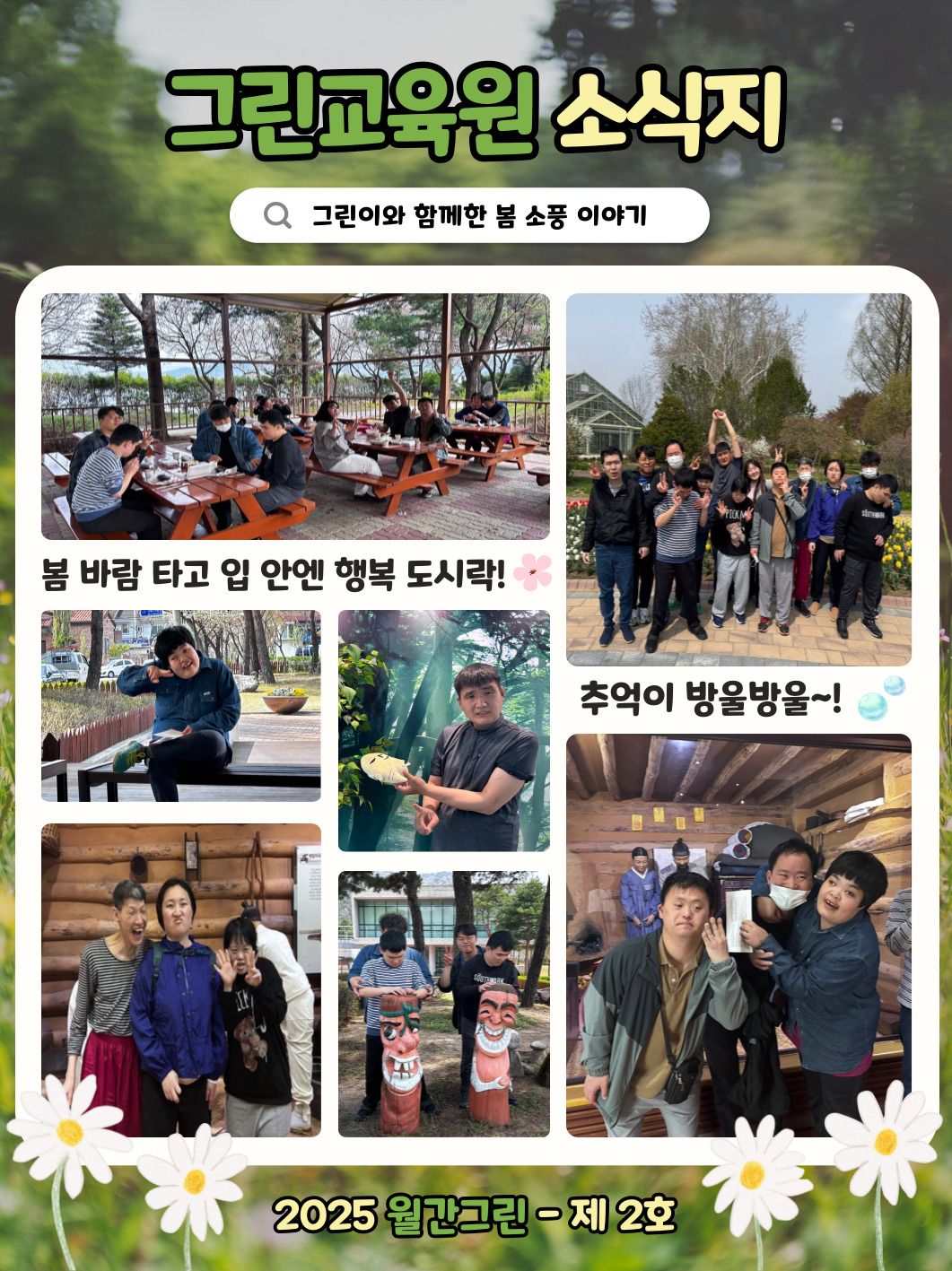 안녕하세요~ 그린교육원입니다! 많이 기다리셨나요?월간그린 제2호를 소개합니다!제 2호에는 그린교육원의 3, 4월 이야기를 담았습니다. 올해 그린교육원은 춘천시 평생학습관에서 진행하는 장애인평생학습도시 운영사업에 선정되어매달 신나는 체험학습과 뷰티케어 프로그램을 진행하고 있답니다!즐거웠던 그린교육원의 3,4월 이야기를 많이 봐주시고, 그린교육원에도 많은 사랑 부탁드립니다. 감사합니다