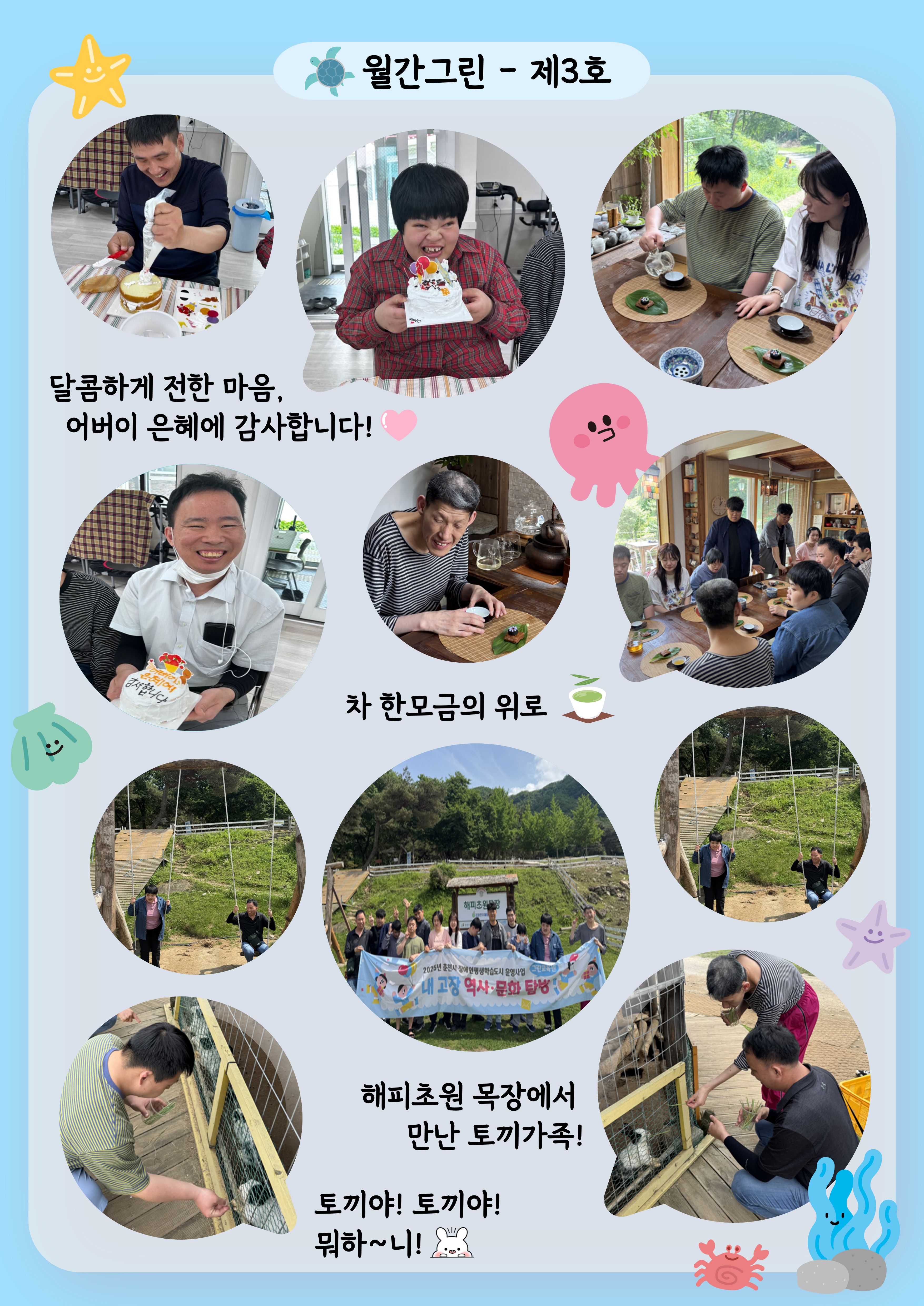안녕하세요, 그린교육원입니다! 그린교육원의 행복웃음 가득했던 월간그린 5월호를 공개합니다!5월에는 그린교육원 이용자분들이 목빠지게 기다리던 춘계 캠프를 다녀왔으며,장애인 평생학습도시 활동인 해피초원목장 탐방, 다도체험 등 다양하고 새로운 프로그램을 많이 진행했습니다!몸도 마음도 건강해지는 5월을 보낼 수있게 도와주신 후원자님들께 감사의 말씀 전달드립니다.6월 그린이야기도 많이 기대해주세요! 감사합니다