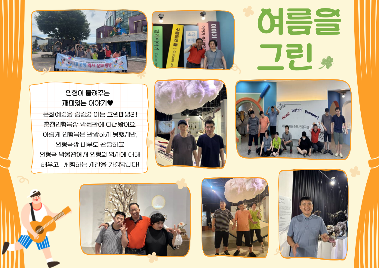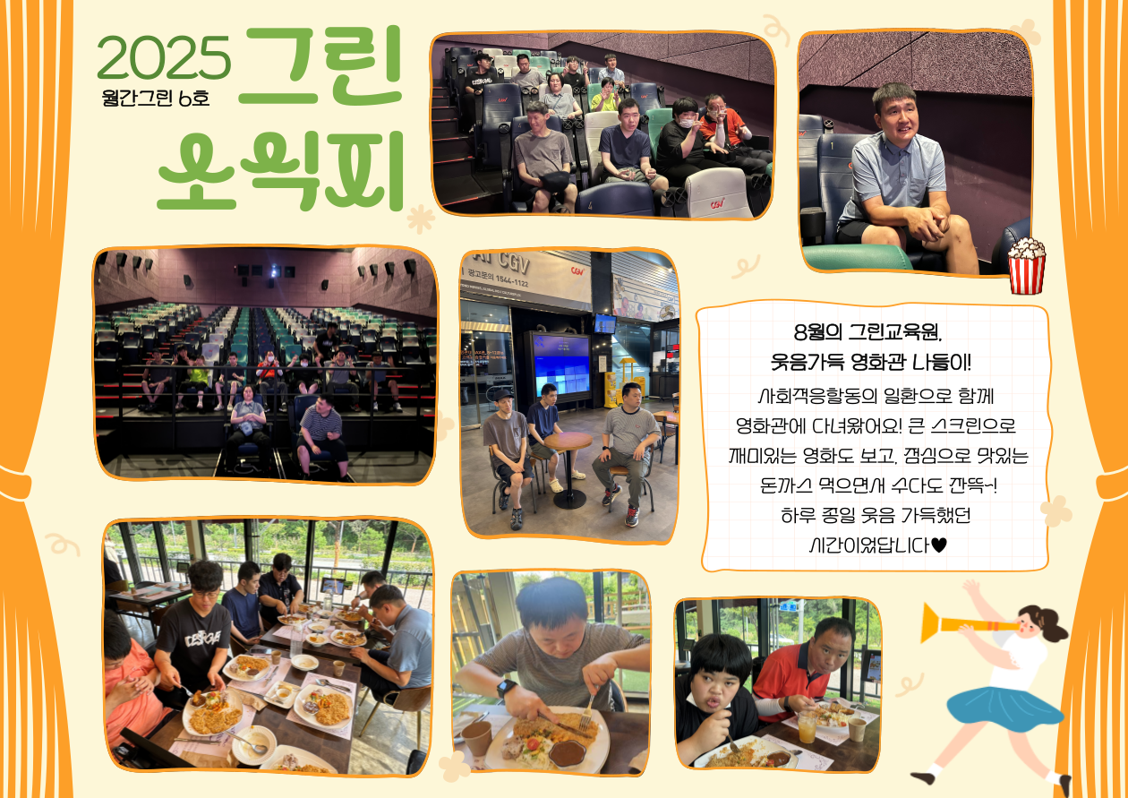 안녕하세요, 그린교육원입니다!8월 월간그린 소식을 올려드립니다8월에도 무더운 날씨가 이어졌지만, 그린교육원 이용자분들의 밝은 웃음 덕분에행복이 마르지 않는 한달을 보낼 수 있었습니다.9월에는 선선한 가을바람과 함께 어디론가 여행을 떠나보시는것은 어떨까요? 9월 소식도 많이 기대해주세요~ 감사합니다!