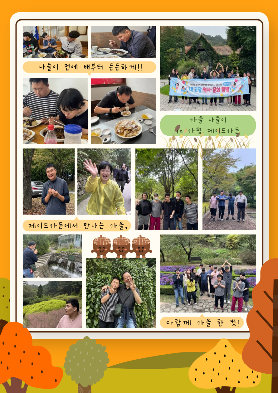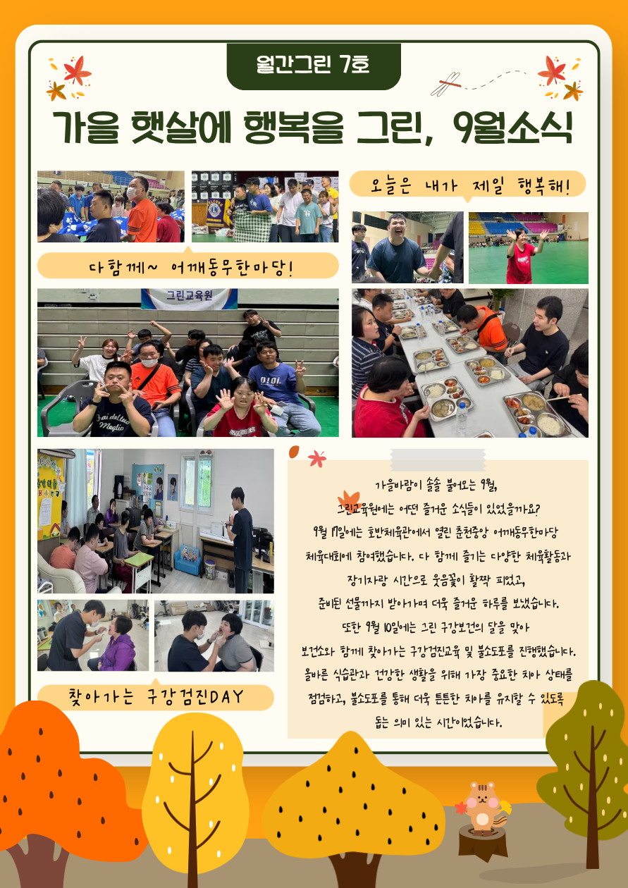 안녕하세요, 그린교육원입니다!선선한 바람이 불어온 9월, 그린교육원에서는 이용자분들과 함께 신나는 한 달을 보냈습니다. 이번 달에는 어깨동무한마당 체육대회에 참여해 다 같이 웃고 즐기는 시간을 가졌고, 가평 제이드가든으로 나들이를 다녀오며 알록달록 풍경 속에서 행복한 추억도 가득 쌓았답니다. 다가오는 10월 그린이야기도 즐거운 소식과 따뜻함 가득담아 전해드릴게요~ 감사합니다!