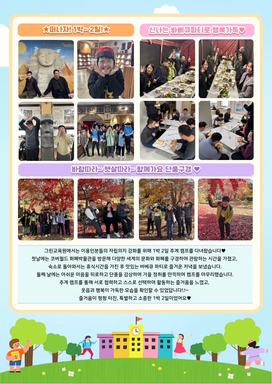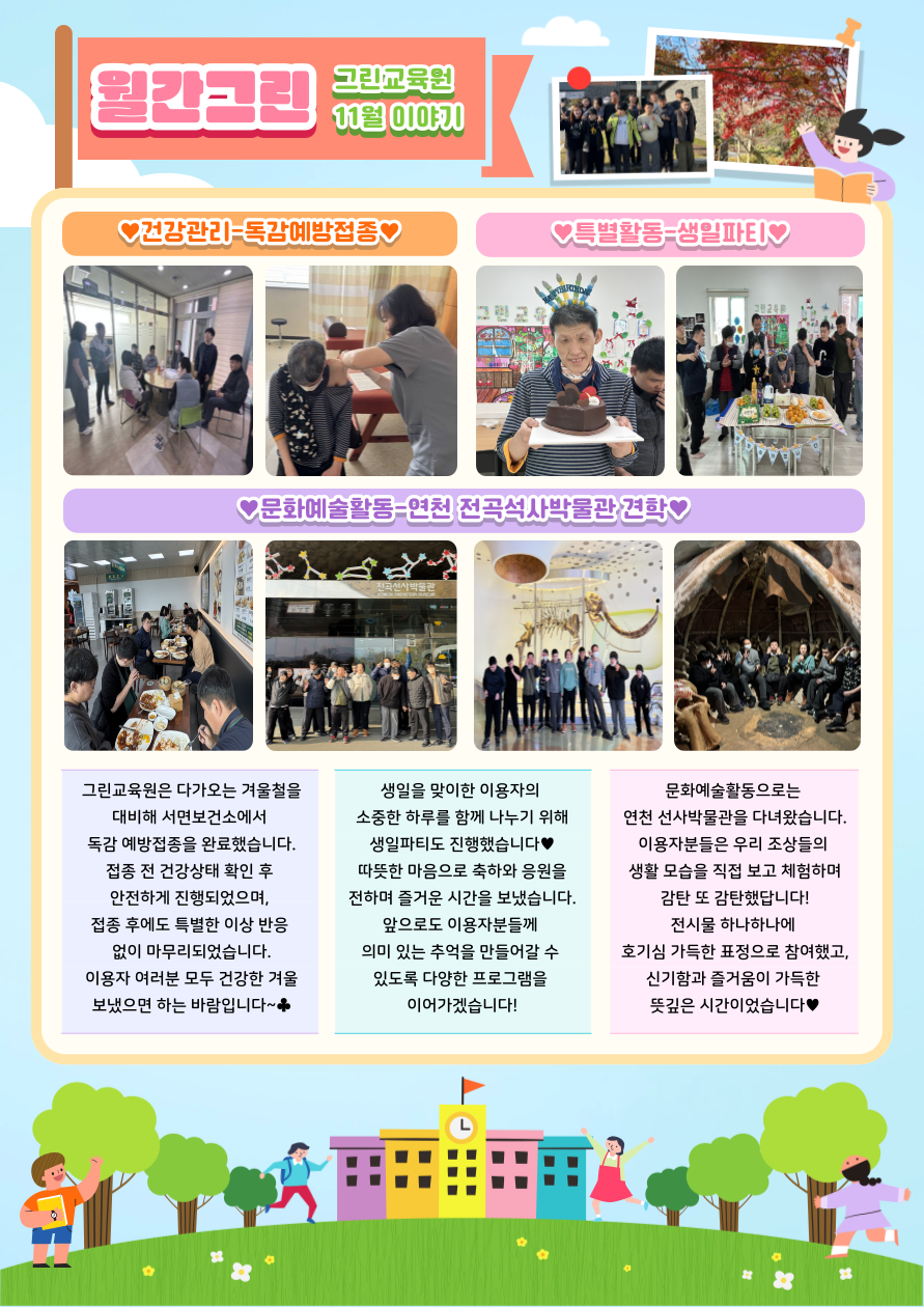 안녕하세요, 그린교육원입니다! 2025년을 시작한 지 어느덧 11개월이 흘러, 이제 한 달만 남았습니다. 여러분의 2025년은 어떤 한 해였나요? 그린교육원 이용자분들에게는 2025년이 어떤 한 해 였을까요? 11월엔 다양한 프로그램으로 사랑과 행복이 가득했던 그린교육원은, 12월에도 한 해를 아름답게 마무리하기 위해 준비하고 있습니다. 연말의 풍성한 분위기를 느낄 수 있는 12월 그린소식지도 많이 기대해주세요! 감사합니다.